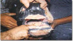 - İç ağız bölgesinde kızarıklık, Yem yememe, Ağızdan salya akması, ağız salya akması, dilin soyulması, dilin dışarı çıkması görülür.Bazen yakın veziküller birleşerek bulla adını alır ve daha büyük hale gelirler.