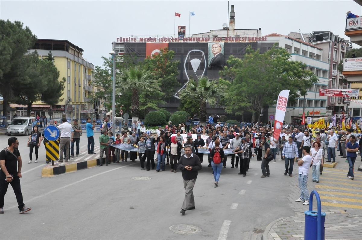 Soma Sosyal Haklar Derneği, DİSK, KESK, bazı oda ve siyasi parti temsilcileri Ege Linyit İşletmesi (ELİ) önünde toplandı, Beşyol Madenci Heykeli'ne karanfil bırakan grup Cengiz Topel Meydanı’na kadar yürüdü.