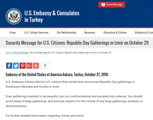 Barışçıl gösterilerin dahi çatışmalı bir ortama ve şiddete dönüşebileceğini belirten ABD Büyükelçiliği, İzmir için ise Cumhuriyet Meydanı ve Kordon'daki toplantı ve Cumhuriyet Bayramı kutlamaları için aynı uyarıyı yaptı.