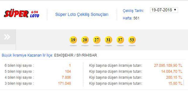 Süper Loto’nun 561’inci hafta çekilişinde 6 bilen 1 kişi, 27 milyon 95 bin 109 lira 90 kuruş ikramiyenin sahibi oldu.