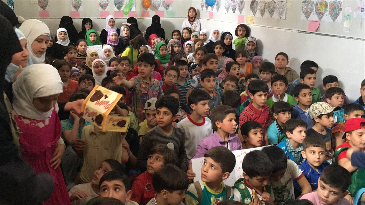 HATAY (AA) - Ülkelerindeki iç savaşın sürdüğü İdlib'in Eriha beldesinde eğitimlerini binaların bodrum katlarında ve sığınaklarda açılan "Muslım Care" okulunda sürdüren Suriyeli öğrenciler, Halep'teki olaylara tepki gösterdi.