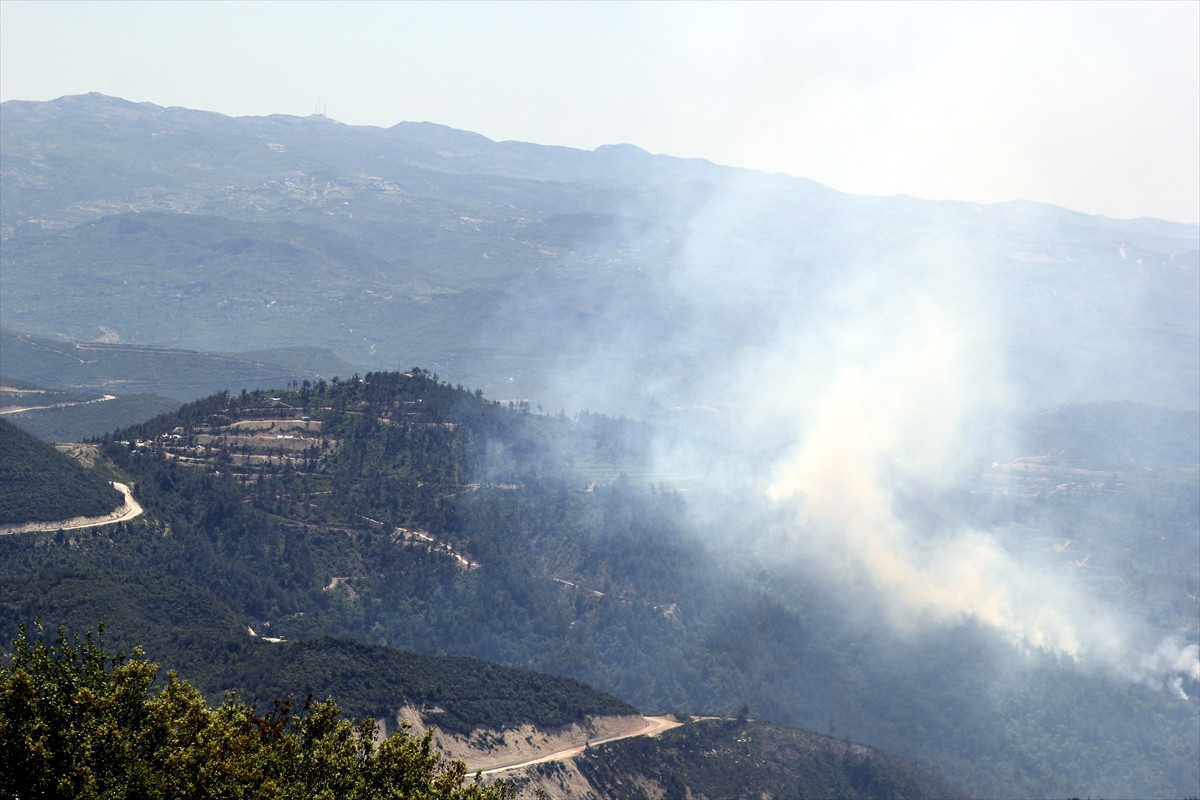 Yayladağı karşısındaki ormanlık alanda iki farklı noktada çıkan yangın Türkiye sınırını tehdit ederken Yayladağı Orman İşletme Şefliği ekipleri bölgede hazır bekliyor.