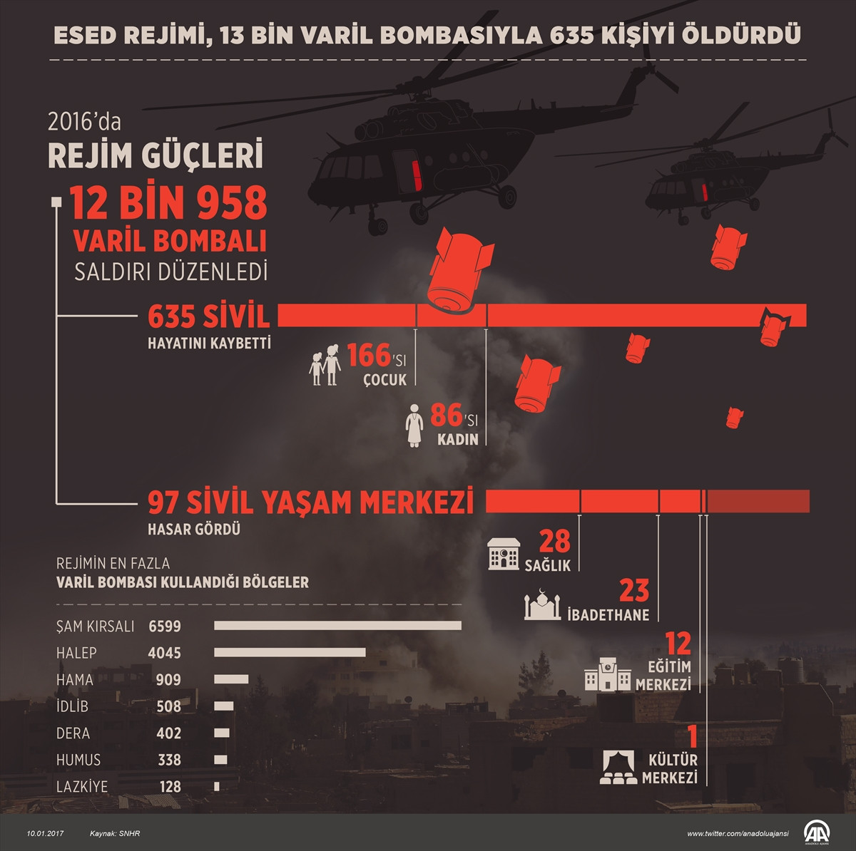 Suriye İnsan Hakları Ağı, hazırladığı raporda, "Rejim güçlerinin geçen sene 12 bin 958 varil bombasıyla düzenlediği saldırılarda, 166'sı çocuk, 86'sı kadın 635 sivil hayatını kaybetti." ifadesi kullanıldı.
