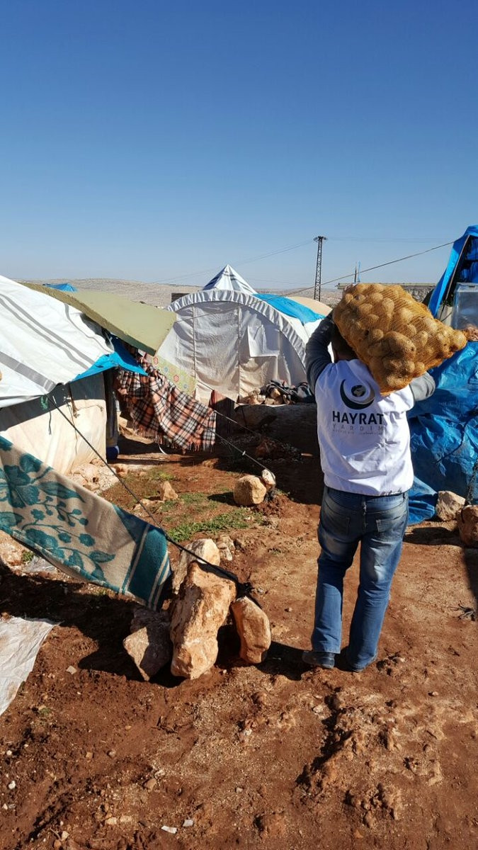 HATAY (AA) - Fırat Kalkanı Harekatı kapsamında terör örgütü DEAŞ'ten kurtarılan Cerablus'a ve İdlib'deki ailelere, Hayrat Yardım Derneğince bin 500 kişiye un ve patates yardımı yapıldı.