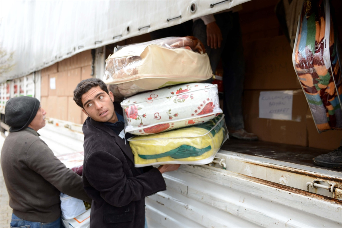 Gıda, yatak, battaniye, soba, ayakkabı, çocuk bezi ve mamadan oluşan yardım malzemelerinin yüklendiği 6 tır, Öncüpınar Gümrük Kapısı'ndaki işlemlerin ardından tampon bölgedeki Suriye plakalı araçlara nakledildi.