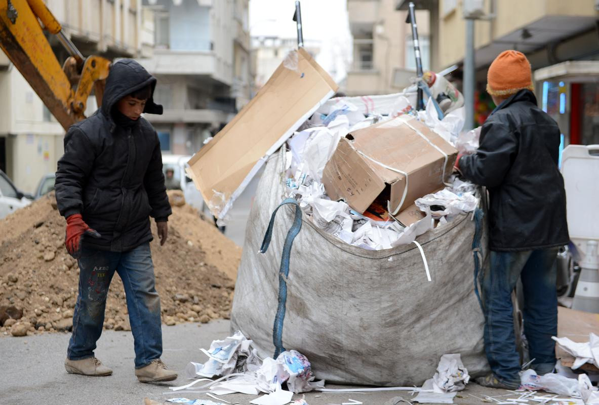 KİLİS (AA) - Ülkelerindeki iç savaştan kaçarak Kilis'e yerleşen ve sokakta kağıt toplayarak ailesine katkıda bulunmaya çalışan çocukların durumdan etkilenen lise öğrencisi Mustafa Merkepçioğlu, Suriyeli çocuklar için kağıt topluyor.