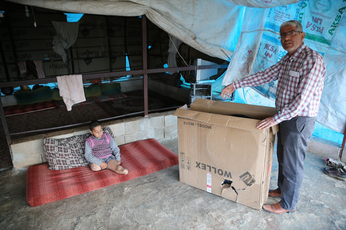 Suriye'de rejim güçlerinin bombalı saldırıları nedeniyle babasını ve bacaklarını kaybeden çocuğa biraz olsun destek vermek istediklerini anlatan Tunç, "Bağışçımız Alperen Zekeriya Çulha tarafından temin edilen tekerlekli sandalyeyi Reyhanlı'da yaşayan minik evladımıza teslim ettik." dedi.