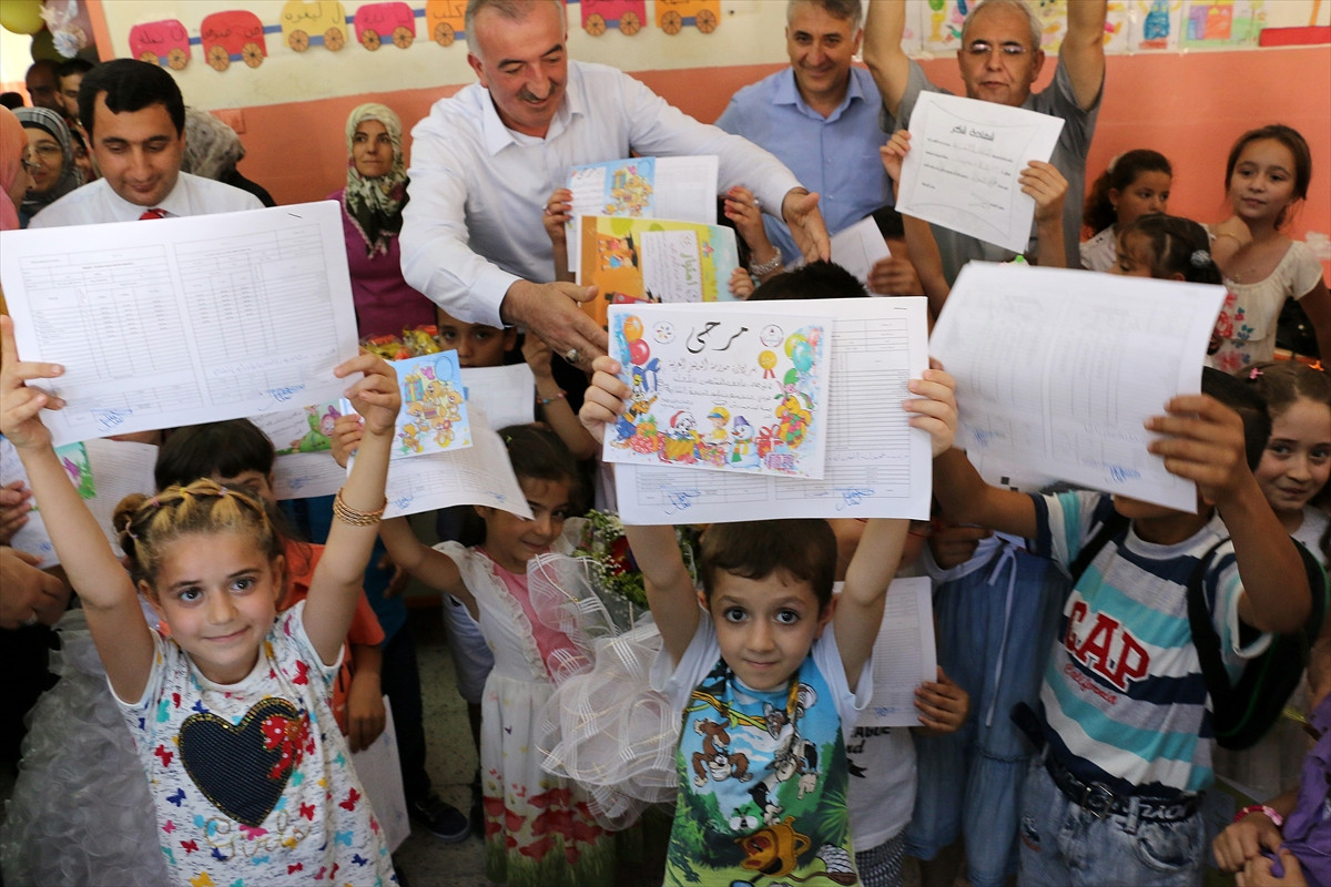 Konuşmanın ardından Suriyeli öğrencilere karneleri ve çeşitli hediyeler dağıtıldı.