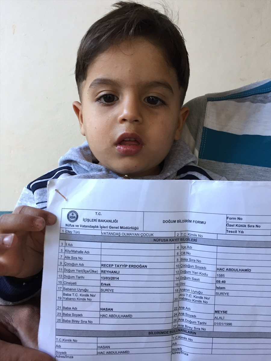 Kendilerine kucak açan Türkiye'de 2,5 yıl önce bebek sahibi olduklarını ifade eden baba Abdulmecit, "Bizler Suriye'de sıkıntılar çekerken Türkiye yardım elini uzattı. Bizim gibi binlerce Suriyeli kardeşimiz Türkiye'ye sığındı. Bunu yapan başka ülke olmadı. Bu yüzden çocuğumuza bize kucak açan Türkiye'ye minnettarlığımızı belirtmek için çok sevdiğimiz Cumhurbaşkanı Recep Tayip Erdoğan'ın adını verdik. Tek üzüntümüz oğlumun ülkesinden uzakta büyümesi." diye konuştu.
