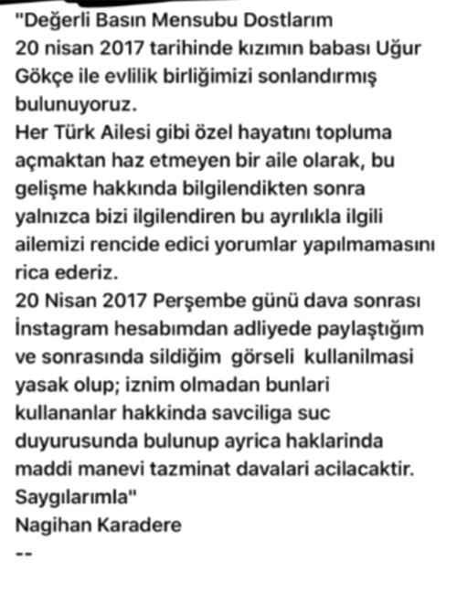 Survivor yarışmasıyla tanınan Nagihan Karadere'nin eşi Uğur Gökçe'ye ait olduğu iddia edilen fotoğraflar sosyal medyada yayılmış ve Gökçe'nin eşini aldattığı iddia edilmişti. Fotoğrafları gören eski milli atlet, eşinden boşanma kararı aldı. Çift dün boşandı.