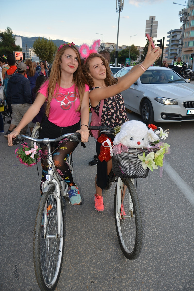 Merkez Nilüfer ilçesindeki Fatih Sultan Mehmet Bulvarı'ndan başlayan turda bisikletlerini kurdele, balon ve çiçeklerle süsleyen yaklaşık 500 kadın, 10 kilometre boyunca pedal çevirdi.