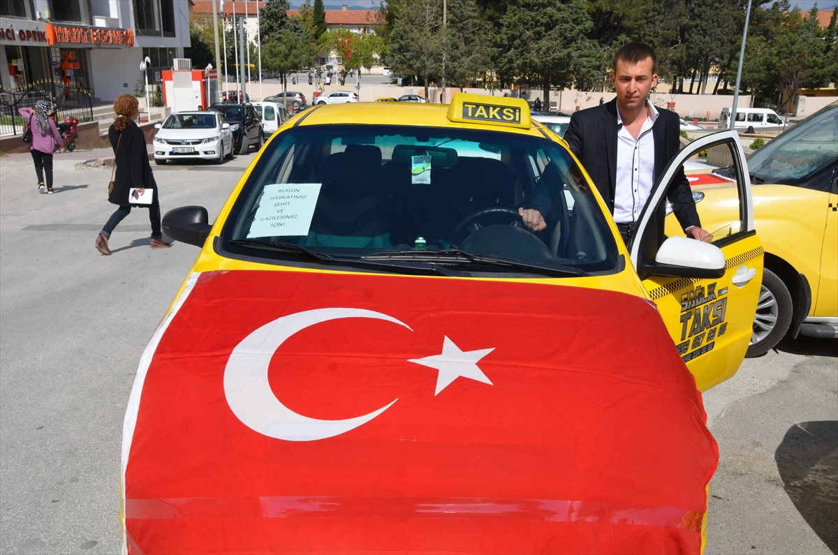 Taksi durağı çalışanlarından Çetin Eroğlu da çok sayıda şehit haberi geldiği için bu konuda duyarlı davranmaları gerektiğini düşündüklerini ifade etti. Bir günlük hasılatlarını Valilik aracılığıyla şehit aileleri ile gazilere bağışladıklarını söyleyen Eroğlu, "Vatan hepimizin vatanı. 'Karıncanın su taşıması' misali bizim de gönlümüzden böyle bir şey yapmak geldi. Hayatını kaybeden şehitlerimize Allah'tan rahmet, gazilerimize acil şifalar diliyorum." dedi. Taksiciler, üzerinde Türk bayrağı ile "Bugün hasılatımız şehit ve gazilerimiz için" yazılı dövizlerin bulunduğu taksileriyle şehir turu attıktan sonra Burdur Şehitliğini ziyaret etti.