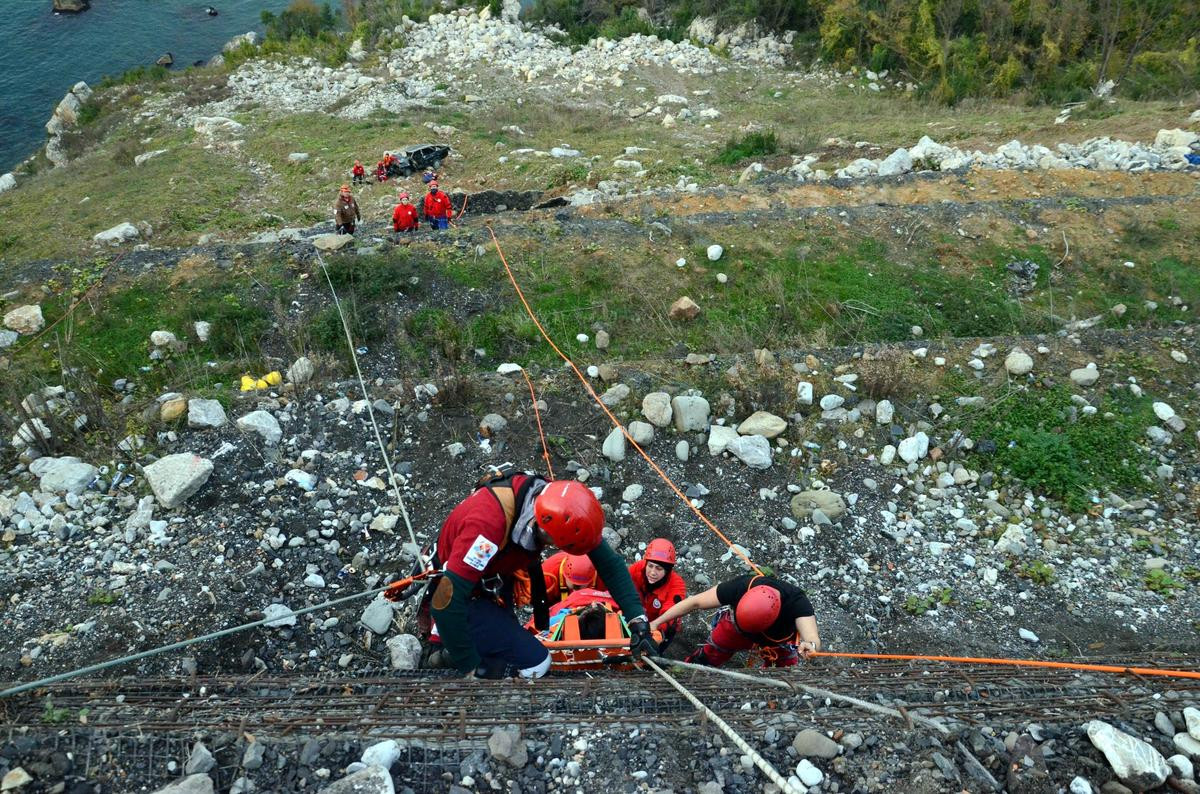 Kozlu ilçesi Ilıksu mevkisinde senaryo gereği yaklaşık 250 metrelik uçuruma yuvarlanarak denize düşen araçtaki yaralıların kurtarılması için olay yerine sevk edilen ekipler, yaralılara ilk müdahaleyi yaptı.