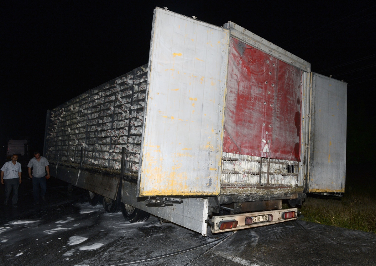 Sağ arka lastiklerden başlayan ve kısa sürede kasa bölümüne sıçrayarak büyüyen yangın, itfaiye ekiplerince söndürüldü. Yangında, tırın dorsesindeki 13 bin 70 tavuktan yaklaşık 8 bini telef oldu.