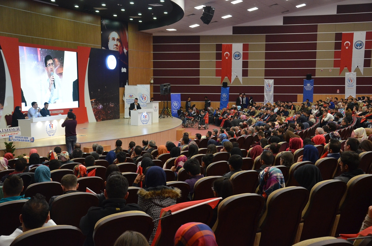 Gençlik ve Spor Bakanlığının "Tecrübe Konuşuyor İçimizdeki Kahramanlar Projesi" kapsamında, Karamanoğlu Mehmetbey Üniversitesi Konferans Salonu'nda sanatçı İsmail Hakkı'nın moderatörlüğünde düzenlenen program, Kur'an-ı Kerim tilavetiyle başladı, Veysel Çelikdemir "15 Temmuz" temalı kum sanatı gösterisi yaptı.