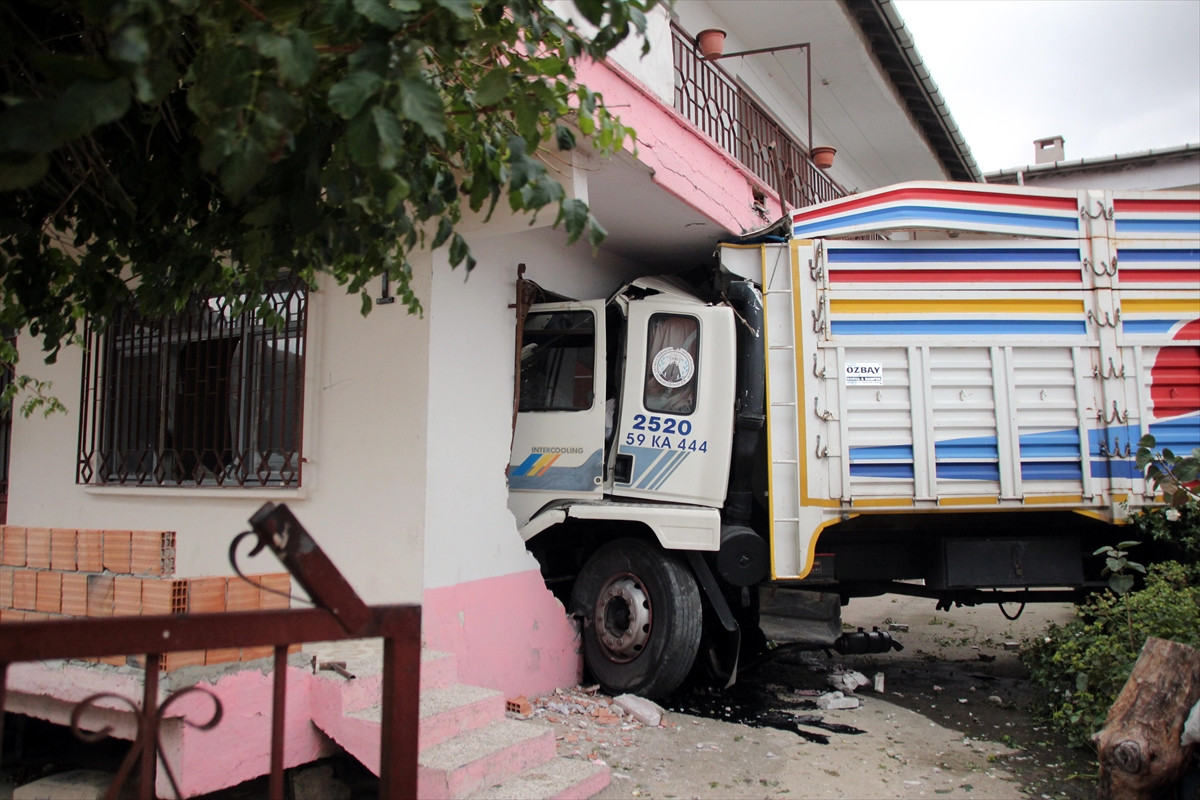 TEKİRDAĞ (AA) - Tekirdağ'da seyir halindeki kamyon, önündeki araca çarptıktan sonra kullanılmayan iki katlı bir eve girdi.