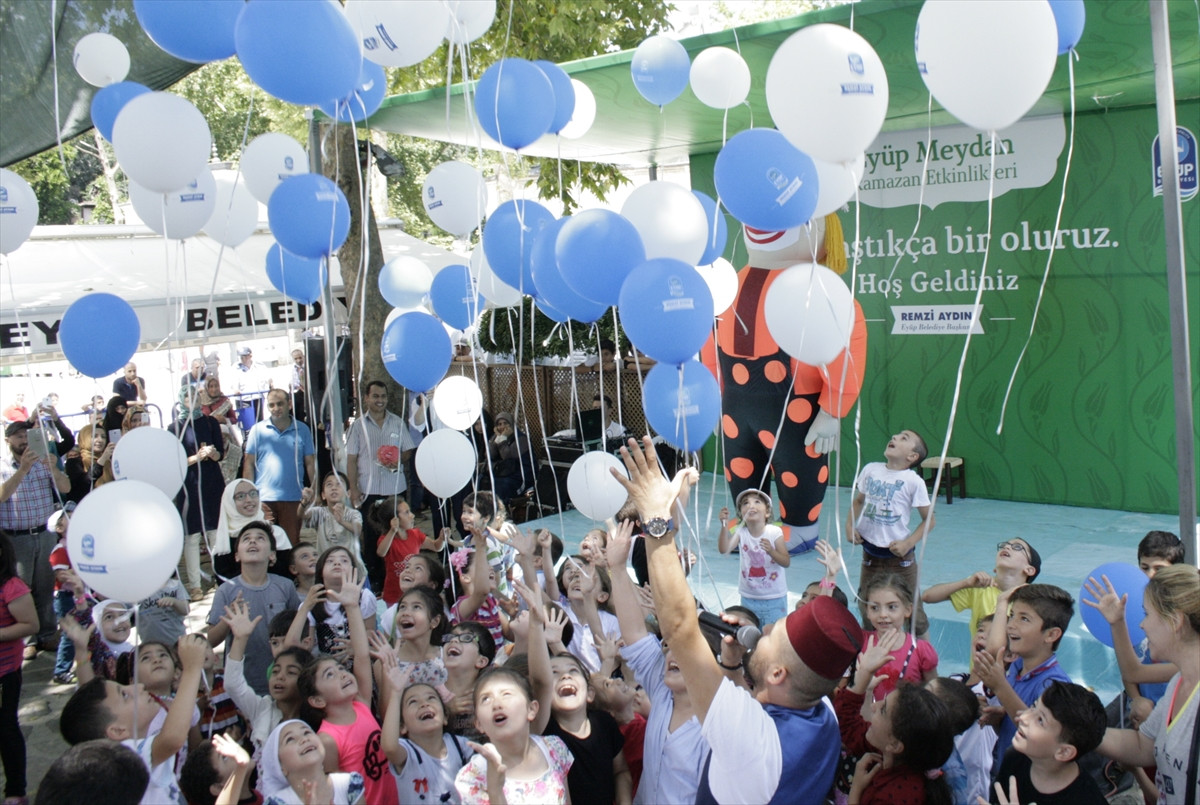 Sahura kalkan ve öğlene kadar bir şey yemeyen çocuklar, ezanla birlikte top patlatılmasını temsilen ellerindeki balonları patlatıp oruçlarını açtı.