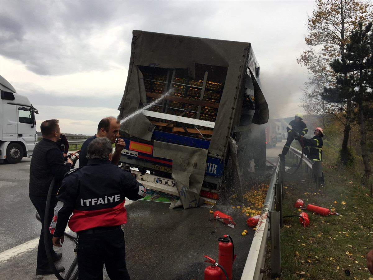 Mahmut Demir idaresindeki 31 V 2765 plakalı mandalina yüklü tır, TEM Otoyolu Kaynaşlı mevkisinde alev aldı.