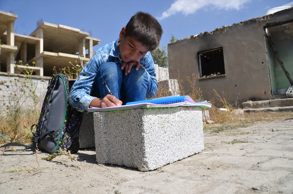 Cumhuriyet Mahallesi'nde hasar gören evlerini onaran babasına yardım eden 5'inci sınıf öğrencisi Zübeyt Öymen, derslerinden geri kalmamak için evin önüne briketlerle kurduğu masada ödevlerini yapıyor.