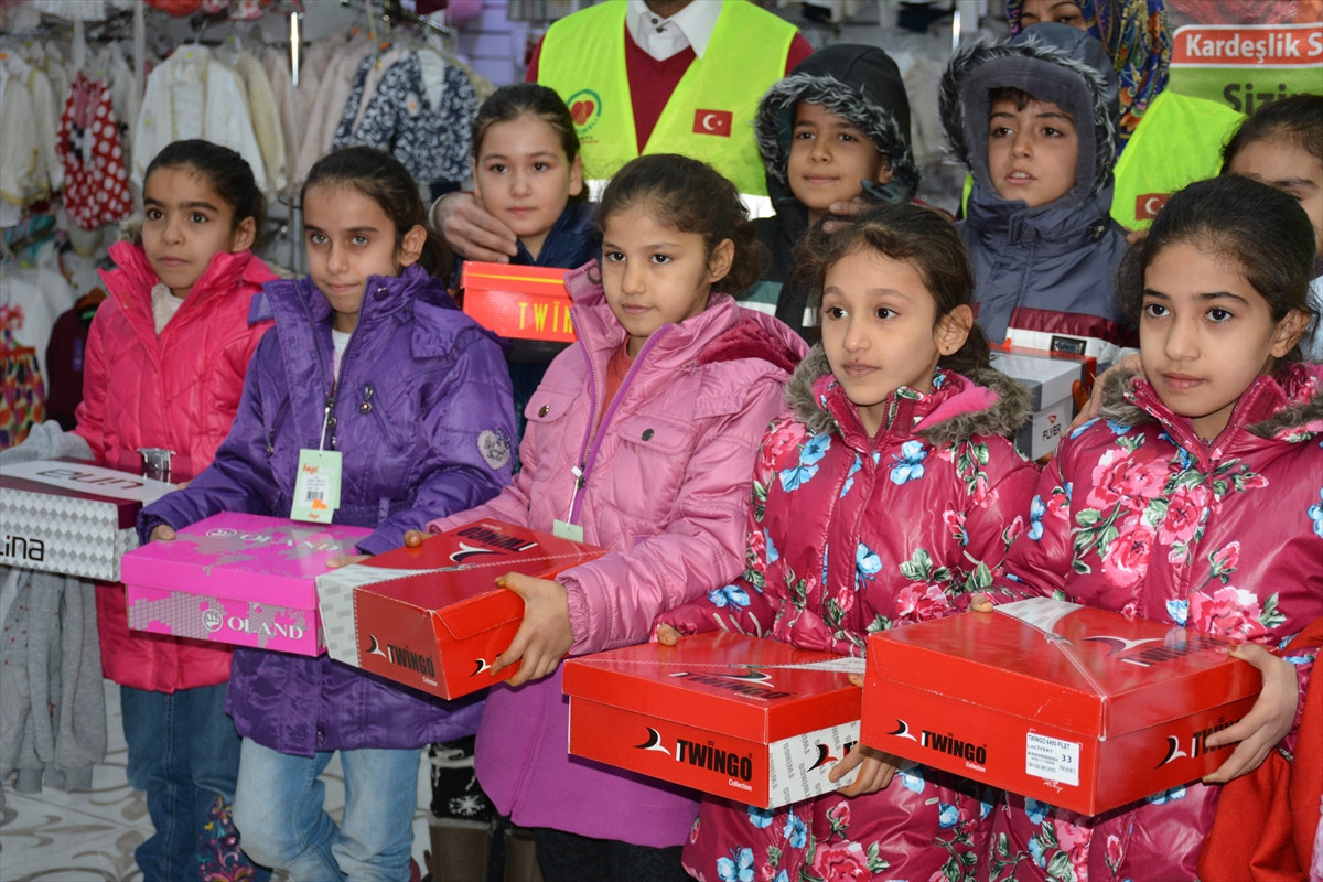 Bir mağazaya götürülen öğrencilere kışlık mont ve bot verildi.