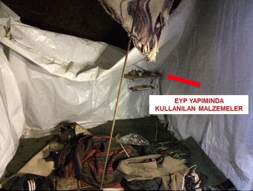Bölücü terör örgütü mensuplarının adeta yaşam alanına dönüştürdükleri sığınakta, 100 kilogramlık 40 el yapımı patlayıcı yapılabilecek kapasitede 80 adet büyük tüp, 220 metre kablo, 220 adet büyük boy pil, 200 adet orta boy pil, 100 adet küçük boy pil, 12 adet 4'lü pil bloku ile 1 adet fünyesiz el bombası ele geçirildi.