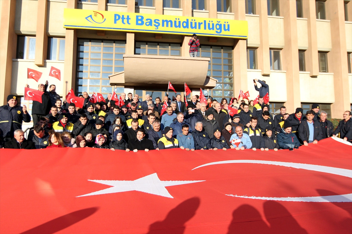 Samsun PTT Bölge Müdürlüğü çalışanları, hizmet binası önünde toplanarak şehitler için dua etti. Saygı duruşunda bulunduktan sonra İstiklal Marşı'nı okuyan çalışanlar dev Türk bayrağı açarak, "Türk-Kürt kardeş, PKK kalleş", "Türkiye'yi kimse bölemez" şeklinde sloganlar attı. PTT Bölge Müdürü Adnan Sert, teröre tepki göstererek, şunları kaydetti: