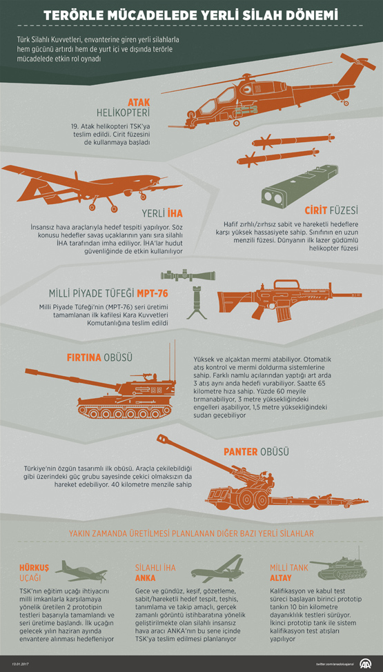 AA muhabirinin derlediği bilgiye göre, NATO'nun en büyük ikinci ordusu olma özelliğini taşıyan TSK, envanterine giren yerli silahlarla hem gücünü artırdı hem de yurt içi ve dışında terörle mücadelede etkin rol oynadı.