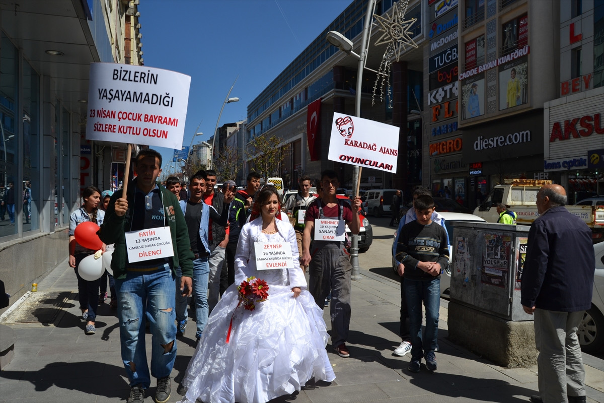 Küçük yaşta evlendirilen, çalıştırılan ve eğitimden uzaklaştırılan çocuklara dikkati çekmek isteyen tiyatro oyuncuları, kentin en işlek yeri Cumhuriyet Caddesi'nden Lalapaşa Meydanı'na kadar pankartlarla yürüdü.