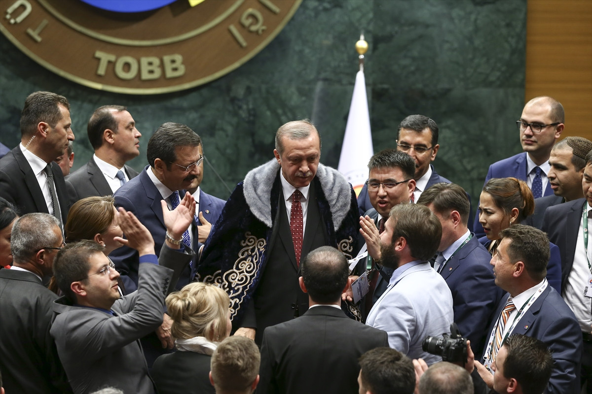 TOBB Başkanı Rifat Hisarcıklıoğlu'nun, "Yılda 1 milyon 400 bin işsizi, iş sahibi yapmak için gerekli çalışmayı yapacağız" sözlerini Türkiye için yeni bir sıçrama noktası olarak gördüğünü belirten Erdoğan, TOBB'a teşekkür etti. Bunun çok önemli bir adım olduğunun altını çizen Erdoğan, artan nüfusla beraber bakıldığında 1,5 milyon işsizin, 1 milyon 400 bin üyesi bulunan TOBB çatısı altında iş sahibi yapılmasının, hem işverenler hem de ülke için çok büyük bir dinamizmin kazanılması anlamına geleceğini söyledi.