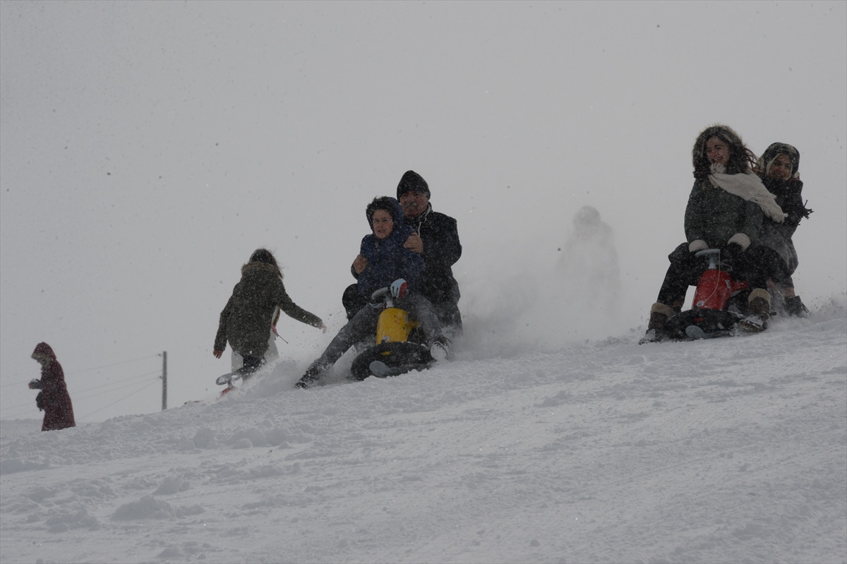 Başçiftlik Belediyesi tarafından Karacaören Yaylasında üçüncüsü organize edilen şenliğe katılan vatandaşlar, ipli kayak, kızak, tepsi, şamyel, naylon gibi malzemelerle kayak yaptı.