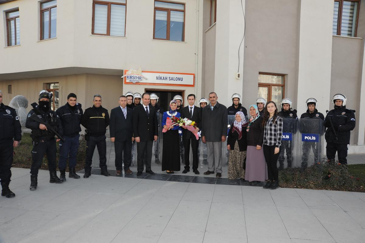 KIRŞEHİR (AA) - Kırşehir Emniyet Müdürlüğü Çevik Kuvvet Şube Müdürlüğünde toplumsal olaylara müdahale aracı (TOMA) şoförü olarak görev yapan polis memuru Mehmet Avcı, Mihriban Çınkı ile polis kalkanları arasından geçerek nikah masasına oturdu.