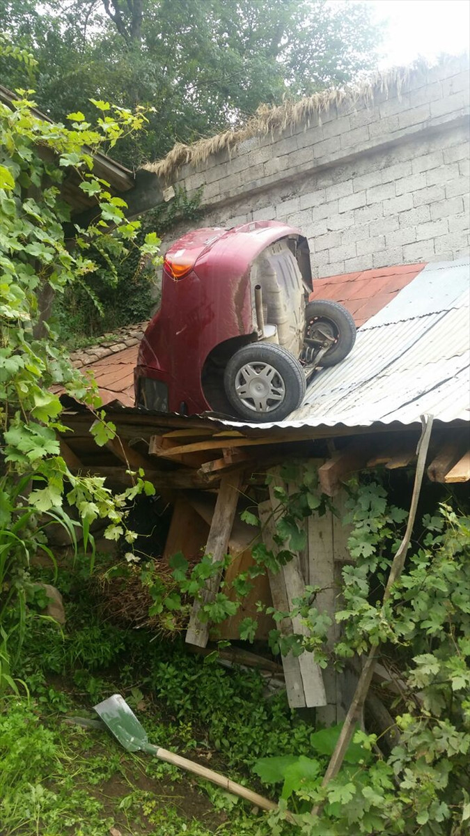Çarpışmanın etkisiyle 61 VC 110 plakalı otomobil, yolun alt kesiminde bir evin bitişiğindeki seranderin çatısına düştü.
