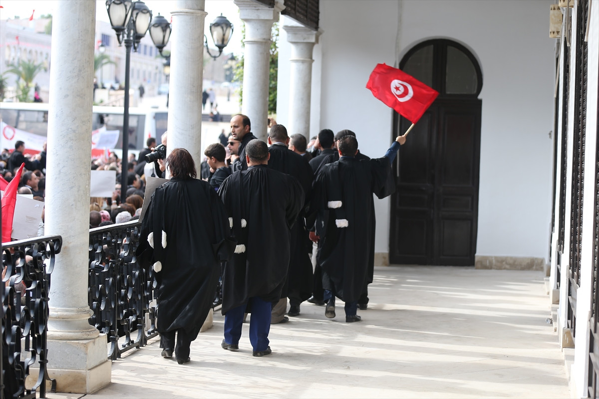 Başkent Tunus'ta, Adalet Sarayından hükümet binasına yürüyen avukatlar yeni maliye yasasının iptalini talep etti. Avukatlar, Başbakanlık önündeki barikatları ve polis engelini aşarak hükümet binası önünde toplandı.