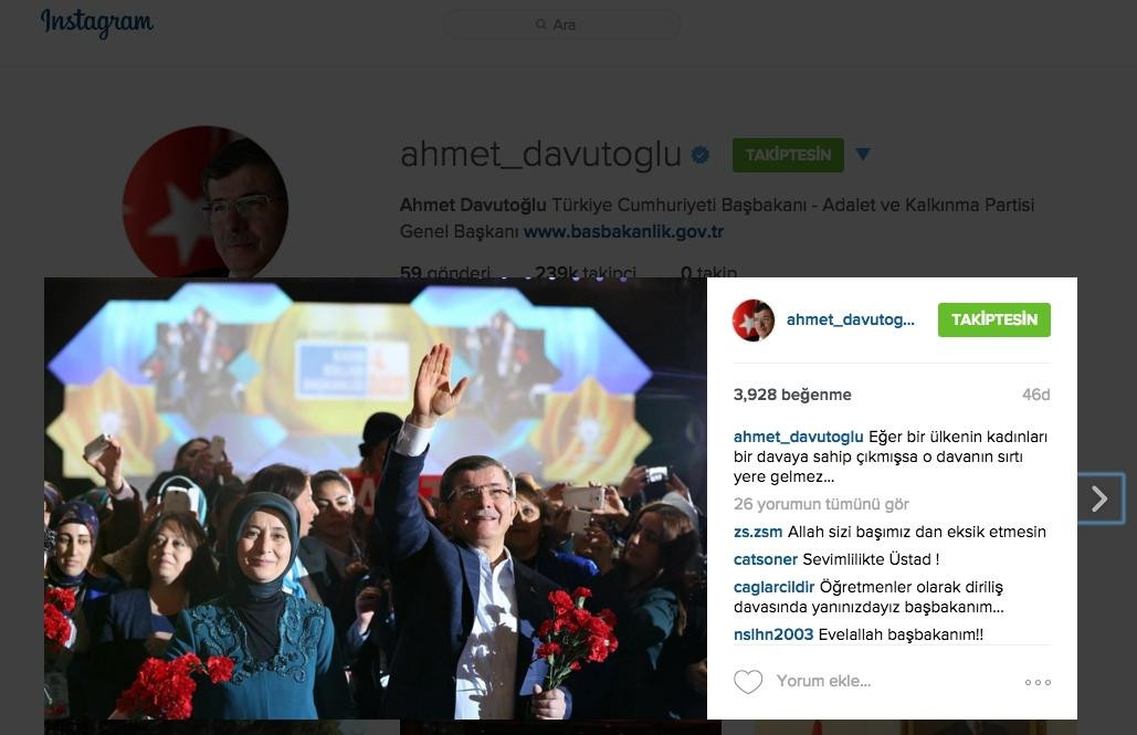 AK Parti Genel Merkez Kadın Kolları Başkanlığı 4. Olağan Kongresi'ne gelişinde eşiyle birlikte vatandaşları selamlarken çekilen fotoğrafı da Instagram hesabından paylaşan Davutoğlu mesajında, "Eğer bir ülkenin kadınları bir davaya sahip çıkmışsa o davanın sırtı yere gelmez" ifadesini kullandı.