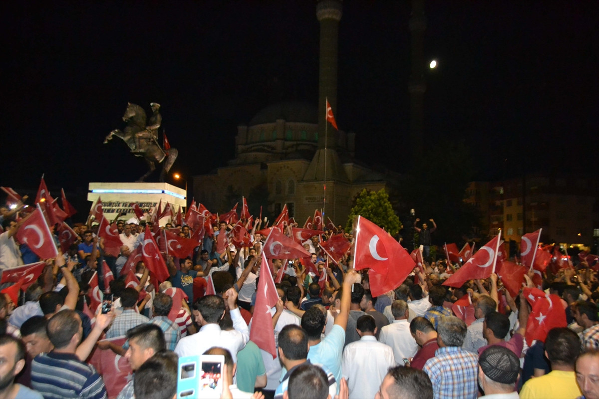 Uğur Mumcu Caddesi üzerinde AK Parti İlçe Başkanlığı önünde toplanan vatandaşlar, ellerinde Türk bayraklarıyla 'Dik dur eğilme, millet seninle' ve 'Recep Tayyip Erdoğan' sloganları atarak Belediye Meydanı’na yürüdü.