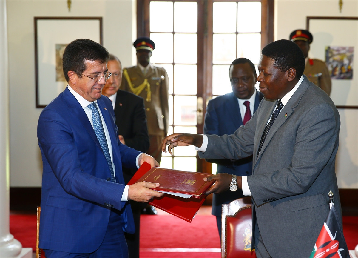 Erdoğan ile Kenya Cumhurbaşkanı Uhuru Kenyatta'nın Cumhurbaşkanlığı Sarayı'nda gerçekleştirdiği görüşme sonrası çeşitli alanlarda iş birliği anlaşmaları ve protokoller imzalandı. Türk Standartları Enstitüsü ile Kenya Standart Ofisi arasında mutabakat zaptını, Türkiye adına Ekonomi Bakanı Nihat Zeybekçi, Kenya tarafından ise Kenya Sanayi, Ticaret ve Kooperatiflerden Sorumlu Bakan Adan Mohammed imzaladı. Kenya Su ve Sulama Bakanlığı ile Yapı Merkezi Başkanlığı arasında Büyük Elgon Dağı Bungoma-Busia çok amaçlı su projesi uygulamasına ilişkin mutabakat zaptına ise Ekonomi Bakanı Nihat Zeybekçi ile Kenya Su ve Sulamadan Sorumlu Bakanı Eugene Wamalya huzurunda, Yapı Merkezi Başkanı Erdem Arıoğlu ile Kenya Su ve Sulama Bakanlığı Genel Sekreteri Dr. Fred H.K. Segor imza koydu. Türkiye Radyo Televizyon (TRT) Kurumu ile Kenyalı muadili KBC arasındaki işbirliği protokolüne ise TRT Genel Müdürü Şenol Göka ile KBC İdare Müdürü Waithaka Waihanya imza attı.