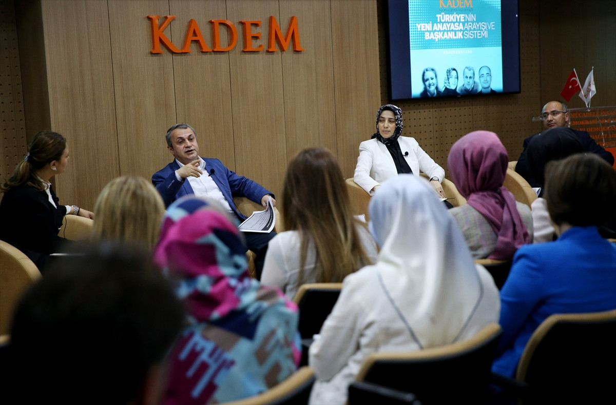 Kadın ve Demokrasi Derneği (KADEM) Genel Merkezi'nde düzenlenen "Türkiye'nin Yeni Anayasa Arayışı ve Başkanlık Sistemi" başlıklı panelin moderatörlüğünü KADEM Başkanı Sare Aydın Yılmaz yaptı.