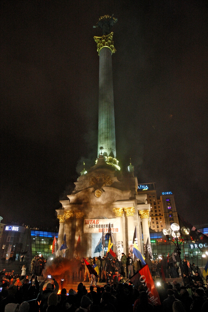 Aynı protestocular Bağımsızlık Meydanı’na birkaç kilometre mesafedeki Lev Tolstoy Meydanı’na geçerek eski Devlet Başkanlığı İdaresi Başkanı Viktor Medvedçuk’un ofisine havai fişek ve duman bombası atarak saldırdı.
