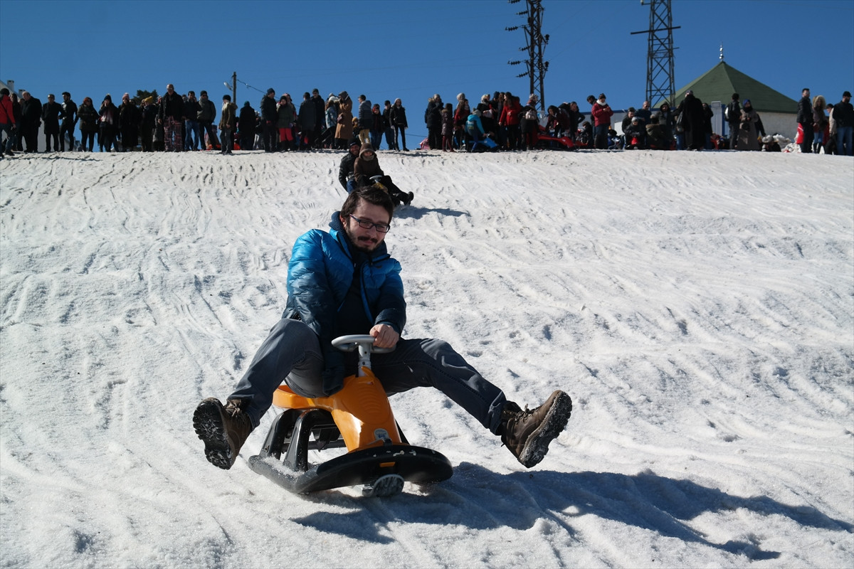 BURSA (AA) - Kış turizm merkezlerinden Uludağ'a gelen günübirlikçiler, kızaklarla kayarak hafta sonu tatilinin keyfini çıkardı.