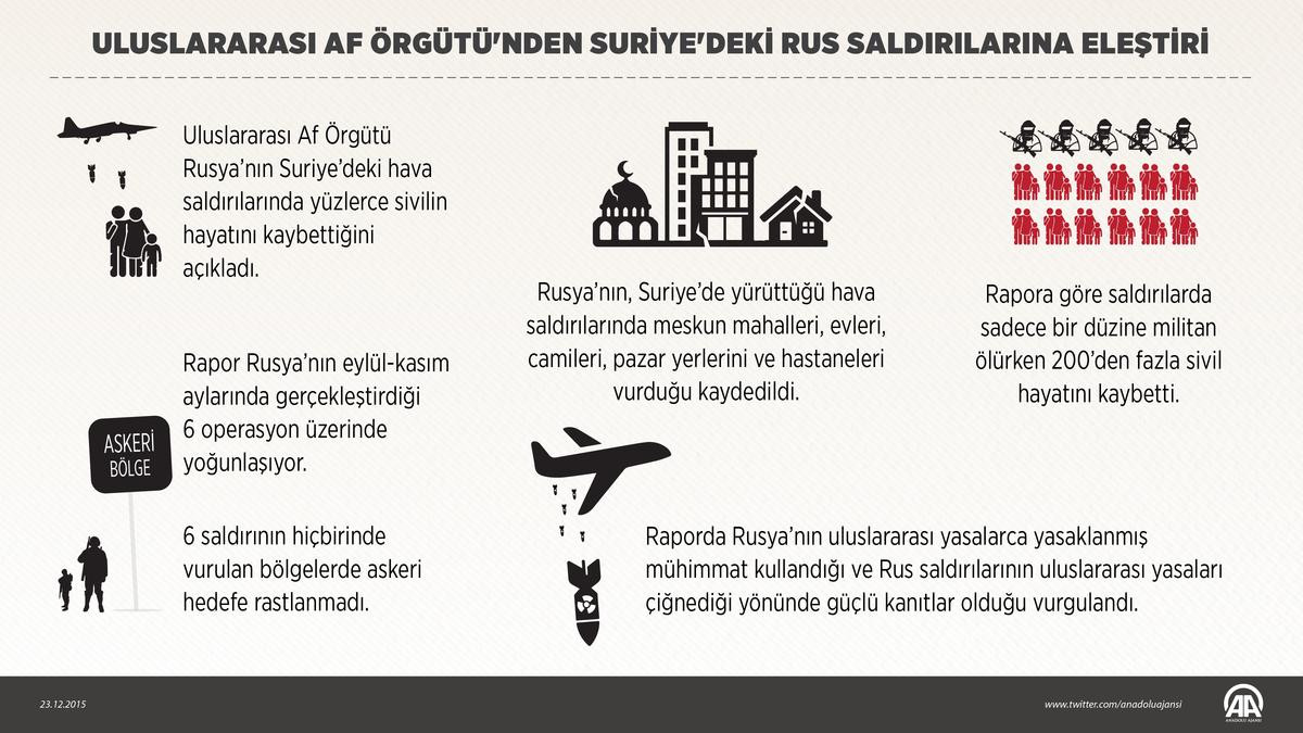 Örgütün yayımladığı son raporda, Rusya’nın Suriye’de yürüttüğü hava saldırılarında meskun mahalleri hedef aldığı, evleri, camileri, pazar yerlerini ve hastaneleri vurduğu kaydedildi. Raporda, Rus saldırlarının uluslararası yasaları çiğnediği yönünde güçlü kanıtlar olduğu da vurgulandı.