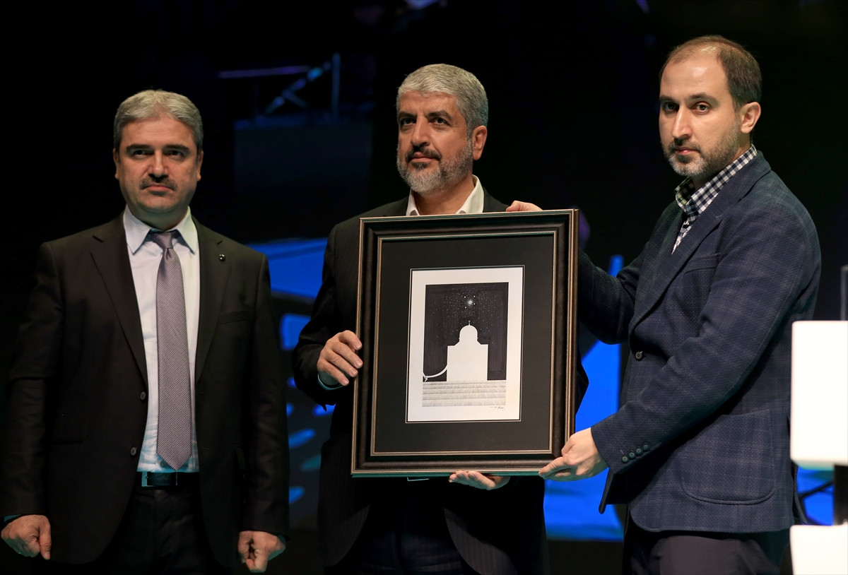 Konuşmaların ardından, Yedi Hilal Derneği Genel Başkanı Enesoğlu tarafından Hamas Siyasi Büro Başkanı Meşal'e tablo hediye edildi.