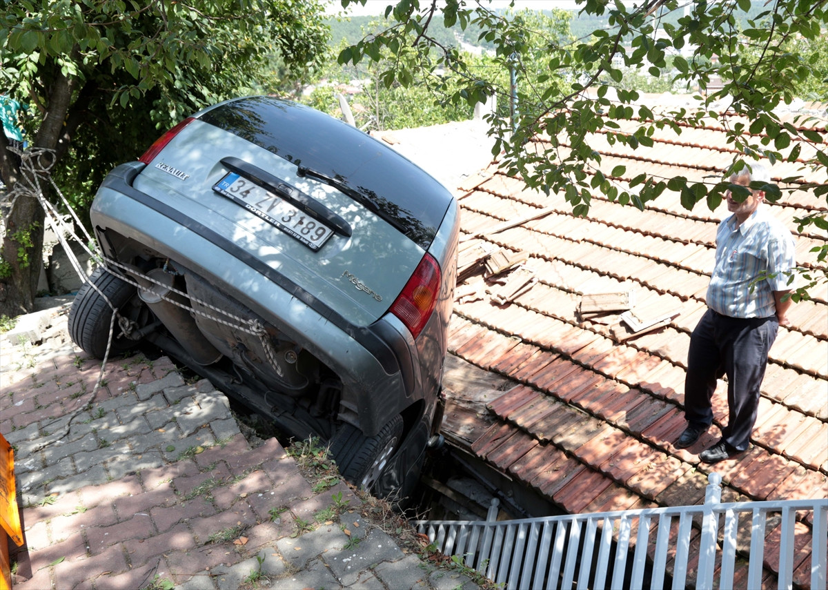 İSTANBUL (AA) - Ümraniye'de sürücüsünün el frenini çekmeden park ettiği aracı, bir evin çatısına düştü.