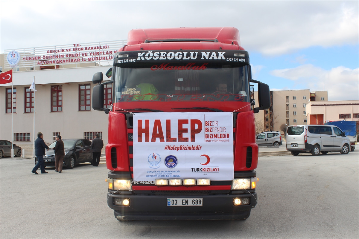 AFYONKARAHİSAR (AA) - Afyonkarahisar'da Gençlik ve Spor Bakanlığı Yüksek Öğrenim Kredi ve Yurtlar Kurumunca (KYK) başlatılan kampanya kapsamında öğrencilerin öncülüğünde temin edilen yardım malzemelerini taşıyan tır, Haleplilere gönderildi.