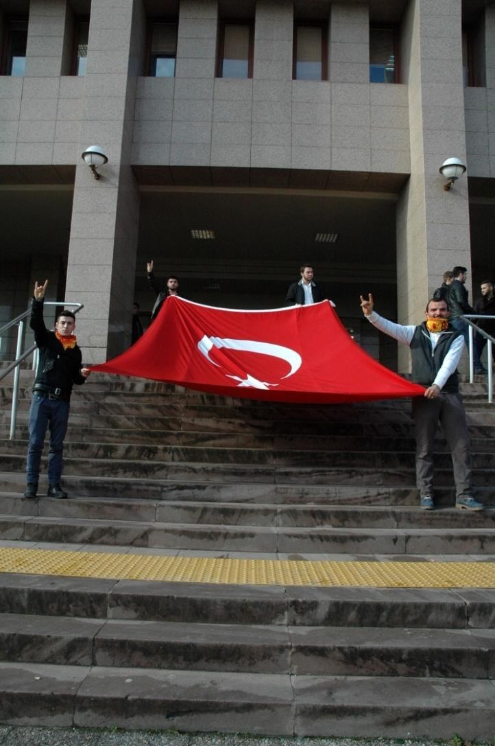 İzmir dışından adliyeye otobüslerle gelen bir grup, "Vatan canım feda sana", "Alparslan Türkeş’'n askerleriyiz", "Rektör istifa" sloganları attı. Duruşmayı izlemek isteyen grup, izin verilmemesi nedeniyle polisle kısa süreli sözlü tartışma yaşadı.