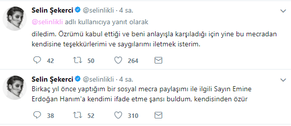 Şekerci, paylaşımında "Birkaç yıl önce yaptığım bir sosyal mecra paylaşımı ile ilgili Sayın Emine Erdoğan Hanım'a kendimi ifade etme şansı buldum, kendisinden özür diledim. Özrümü kabul ettiği ve beni anlayışla karşıladığı için yine bu mecradan kendisine teşekkürlerimi ve saygılarımı iletmek isterim" ifadelerini kullandı.