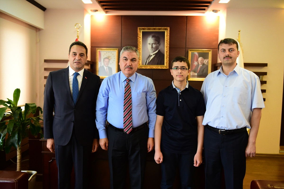 Uşak Valisi Ahmet Okur, Muhammet Yasin Sümter'i sınavlardaki başarısından dolayı makamında kabul etti.