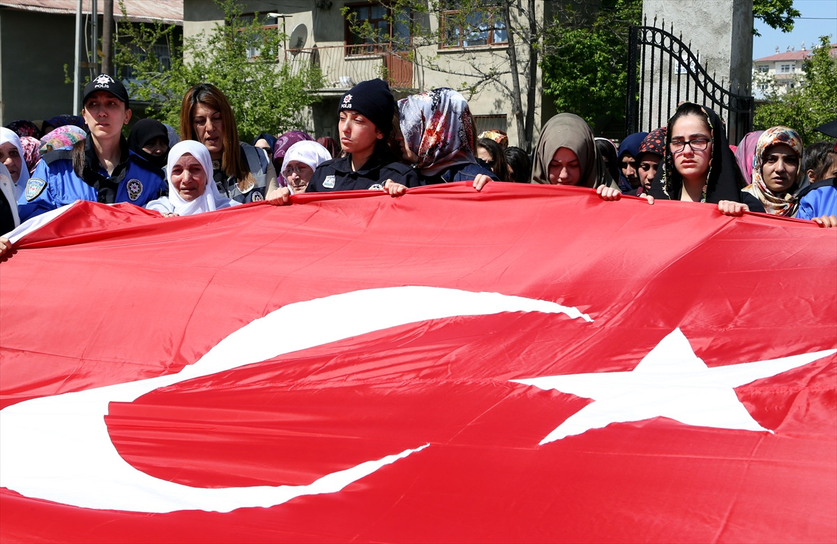 Yaklaşık 5 bin kişinin katıldığı cenaze töreninde, bazı vatandaşlar evlerinin balkonuna Türk bayrağı asarak, teröre tepki gösterdi.