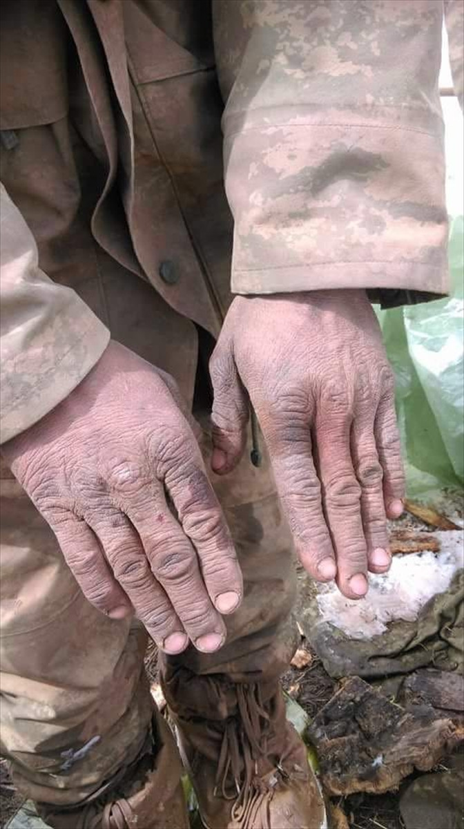 Öte yandan, bir Mehmetçiğin fotoğrafında, yürüttüğü fedakarca mücadelenin izleri, ellerinde ve giysilerindeki lekelerde kendini gösteriyor.