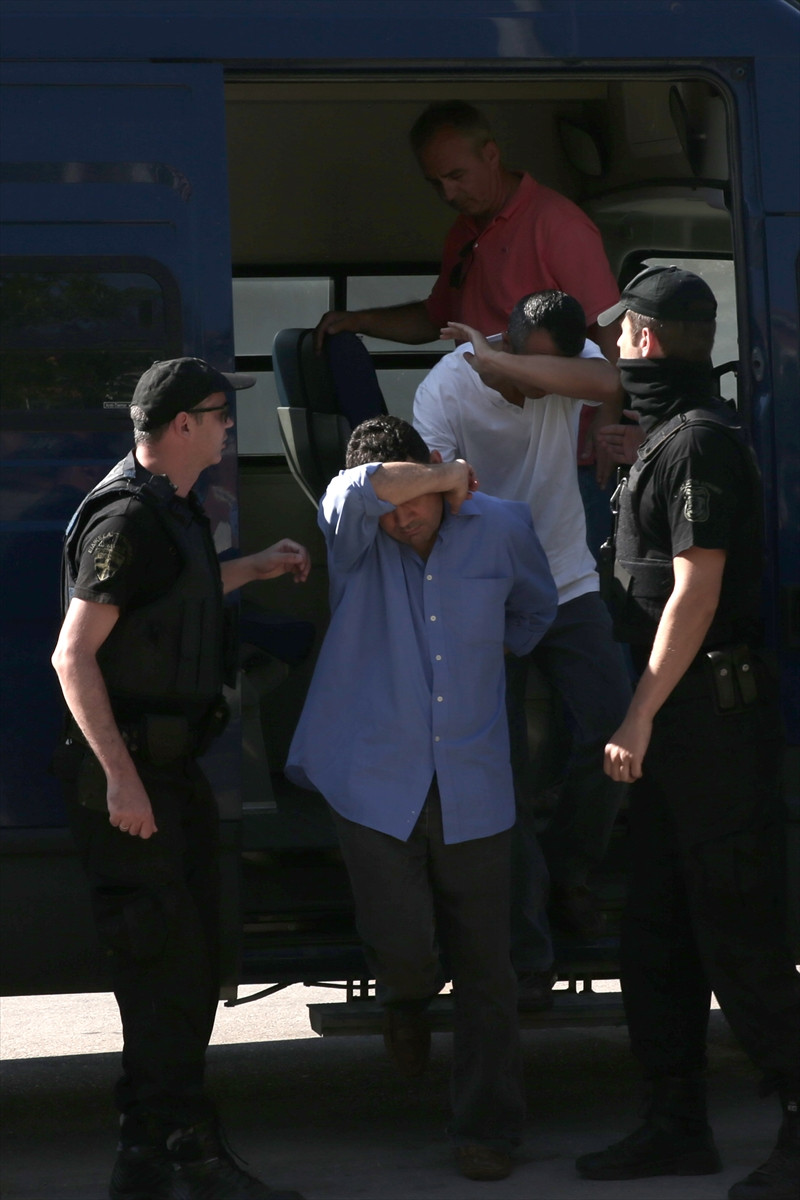 Yoğun güvenlik önlemleri altında minibüsle adliyeye getirilen darbeci askerlerin birbirlerine kelepçelenmesi dikkati çekti. Boştaki elleriyle yüzlerini kapatan darbeciler, polis nezaretinde adliyeye götürüldü. Yunan basınının da yoğun ilgi gösterdiği darbecilerin yasa dışı yoldan ülkeye girme ve komşu ülke ile ilişkileri zedeleme girişiminde bulunma suçlamasıyla yargılanacağı belirtildi.