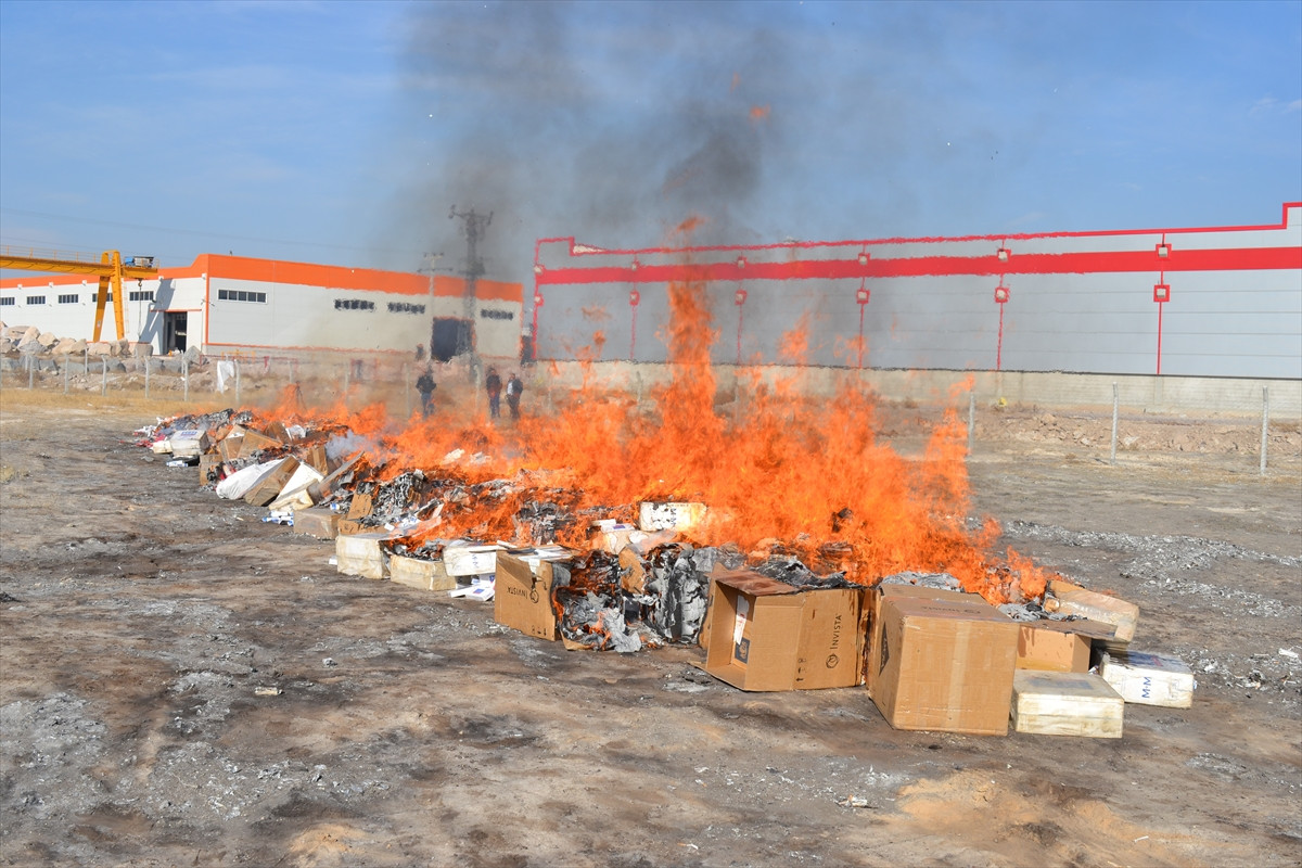 Gümrük kaçağı sigaralar, savcılık talimatı ve emniyet yetkililerinin kontrolünde yakılarak imha edildi.